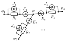 Последнее уравнение получено, исходя из предположения, что все источники тока и ЭДС направлены в сторону рассматриваемого узла. Если какой-либо источник направлен в противоположную сторону, его ЭДС или ток необходимо взять с обратным знаком.