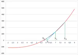 Будем искать нуль функции . Выберем две начальные точки и и проведем через них прямую. Она пересечет ось абсцисс в точке . Теперь найдем значение функции с абсциссой . Временно будем считать корнем на отрезке . Пусть точка имеет абсциссу и лежит на графике. Теперь вместо точек и мы возьмём точку и точку . Теперь с этими двумя точками проделаем ту же операцию и так далее, то есть будем получать две точки и и повторять операцию с ними. Отрезок, соединяющий последние две точки, пересекает ось абсцисс в точке, значение абсциссы которой можно приближённо считать корнем. Эти действия нужно повторять до тех пор, пока не получим значение корня с нужным приближением.