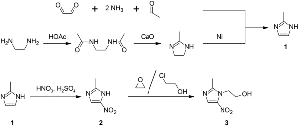 2-метилимидазол (1) может быть получен путём имидазольного синтеза Дебуса-Радзижевского или из этилендиамина и уксусной кислоты, дальнейшей циклизацией диамида в дигидроимидазол путём воздействия оксидом кальция с последующим дегидрированием под действием никеля Ренея. 2-метилимидазол нитрируется для получения 2-метил-4(5)-нитроимидазола (2), который алкилируется этиленоксидом или 2-хлорэтанолом для получения метронидазола (3):[2][3][4]