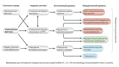 В одном из нейрофизиологических исследований Блэр предлагает фреймворк для понимания поведенческих расстройств, включающий этиологические (генетические и связанные с окружающей средой), нейронные, когнитивные и поведенческие аспекты. По данному фреймворку получается следующее: генетические факторы приводят к снижению активации амигдалы, что в свою очередь снижает уровень эмпатии, а это и является причиной черт эмоционального бесстрастия, антисоциального поведения и инструментальной агрессии (агрессии ради достижения определённых целей; простым примером может послужить причинение физического вреда человеку с целью его ограбления). Ещё одной причиной антисоциального поведения и инструментальной агрессии, а также недостаточной регулируемости реакции на социальные провокации и реактивной агрессии, основанной на разочаровании, являются нарушения в способности принимать решения, что в свою очередь исходит из сниженной активации полосатого тела (стриатума) и вентромедиальной префронтальной коры (vmPFC). Здесь тоже важную роль играет генетическое влияние, но к нему добавляются пренатальные факторы, например злоупотребление матерью психоактивными веществами во время беременности. Кроме того, возникновение нарушений в одной из областей связано с нарушениями в других. Так, при сниженной активации амигдалы можно ожидать сниженную активацию полосатого тела и вентромедиальной префронтальной коры. Такие же факторы среды, как травмы, влияние насилия и пренебрежение в воспитании играют свою роль лишь в повышении активации амигдалы, что приводит к большей чувствительности к угрозам. Впрочем, и здесь не обходится без генетического влияния, оно присутствует во всех рассматриваемых данным фреймворком компонентах[50].