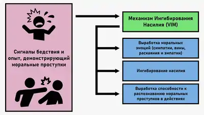 Аналогично обстоит дело и с ингибированием насилия. Ещё в детстве нормально развивающийся индивид при каждой попытке совершить действия насильственного характера будет сталкиваться с активацией VIM ввиду соответствующей реакции жертвы. Со временем к этому начнёт приводить даже сама мысль о насилии и вероятность проявления насильственного поведения индивидом будет постепенно падать.