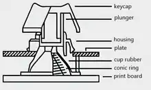 Гибридная резинопружинная технология. Шток традиционно цилиндрический (иногда с крестовым сердечником, чтобы можно было ставить клавиши Cherry MX[24]). Есть два известных производителя данных выключателей: Topre и Niz.Topre производятся только в Японии, поэтому их цена такая высокая. Выключатели Topre используются, например, в Happy Hacking Keyboard, или же в Topre Realforce. Выключатели Niz используются в одноименных клавиатурах.