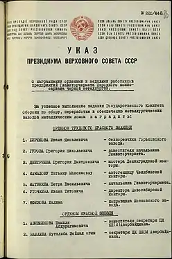 - Указ о награждении орденом Трудового Красного Знамени в электронном банке документов «Подвиг народа».