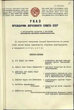 - Страницы указа о награждении Эйюба Мехтиева Орденом Трудового Красного Знамени