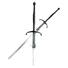 Контактное клинковое колющее и рубящее оружие с прямым средним или длинным массивным двухлезвийным клинком[4].