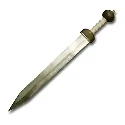 По иной технологии был изготовлен романо-этрусский меч типа gladius Hispaniensis IV в. до н. э. длиной 40 см, найденный в Кьюзе. Его листовидный клинок был выкован из цельной железной заготовки и подвергнут науглероживанию (нагревание железной заготовки в замкнутой ёмкости с органическими веществами, в результате чего происходит насыщение её наружных слоёв углеродом), в результате чего содержание углерода варьируется от 0,05…0,08 % в глубине до 0,35…0,4 % на лезвиях — последняя цифра по современным стандартам соответствует среднеуглеродистой стали. Тем не менее, оба меча отличались в целом невысоким качеством металла, с большим количеством примесей в виде вкраплений шлака.