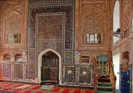 Внутри стены и михраб мечети расписаны живописью с позолотой. Роспись стен состоит из замысловатой вязи и орнамента, составленного из цветов и зелёных частей растений. Зал мечети обходит панель из шестигранных глазурованных плиток, расписанных золотом. Интересен также потолок мечети: он сделан из дощечек, украшенных орнаментом, а также небольшими деревянными куполами.
