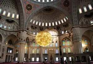 Внутри мечеть украшена витражами и золотыми пластинками, огромными хрустальными люстрами, декоративной плиткой, а также отделана мрамором. По центру её находится модель мечети Масджид ан-Набави, расположенной в Медине, которую подарил в 1993 году король Саудовской Аравии Абдель Азиз президенту Турции Сулейману Демирелю.