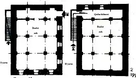 ![]() Слева план первого яруса мечети (для мужчин), справа план второго яруса (для женщин) | |