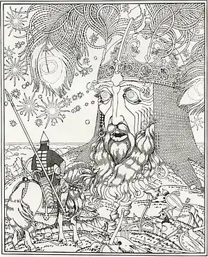 Этот же мотив использует Пушкин в своей поэме «Руслан и Людмила», где Еруслан стал Русланом, а царь Огненный Щит — Черномором. Имя меча, которое настоятельно необходимо богатырю для спасения невесты, уже не называется, да и сама голова настроена агрессивно: