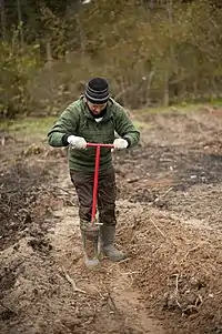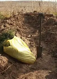 Работа начинается с того, что мечник вгоняет лопату в грунт на всю высоту штыка. Затем раскачивает меч вперед и назад, формируя таким образом лунку для саженца, и очень осторожно вынимает из грунта лопату, так, чтобы не повредить подготовленную ямку. Следующим этапом посадки является погружение сажальщиком корня готового саженца в лунку. Сажальщику необходимо следить за тем, чтобы корень ни в коем случае не перекрутился, не запутался и не согнулся в ямке. Саженец должен располагаться так, чтобы шейка корня была на уровне верха лунки. Сажальщик, расположив деревце, бросает несколько горстей грунта в ямку и дальше придерживает саженец. Тем временем мечник на расстоянии до 10 см от лунки снова погружает меч Колесова в грунт и, немного подтягивая ручку лопаты на себя, уплотняет низ лунки, закрепляя, таким образом, нижнюю часть корня. А для закрепления верхней части – отталкивает ручку от себя.