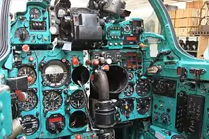 Внутри кабина, приборная доска и пульты окрашены изумрудно-зелёным цветом, ночное полётное освещение кабины — красным светом.