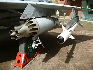 Вооружение самолёта включало встроенную пушку (или две) НР-30 (затем ГШ-23Л) калибра 30 (23) мм, а также ракетное и бомбовое вооружение, подвешивающееся на балочные держатели БДЗ-58-21. Кроме того, допускалась подвеска двух блоков УБ-16-57, в которые заряжались по 16 реактивных снарядов типа АРС-57М; двух АРС-212 или АРС-240; две свободнопадающие бомбы или зажигательных бака. В дальнейшем применялись ракеты К-13, которые размещались на пусковых установках АПУ-28. Также был разработан пушечный контейнер ГП-9 (с пушкой ГШ-23), подвешиваемый в центре под фюзеляжем.