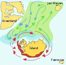 Мойва — кормовая рыба из семейства корюшек, обитающая в Атлантическом и Северном Ледовитом океанах. Летом они пасутся на плотных скоплениях планктона на краю шельфового ледника. Более крупная мойва также питается крилем и другими ракообразными. Мойва большими косяками перемещается к берегу, чтобы нереститься и мигрировать весной и летом в богатых планктоном районах между Исландией, Гренландией и Ян-Майеном. На миграцию влияют океанские течения. Весной и летом созревающая мойва совершает крупные миграции вокруг Исландии на север для кормления. Обратная миграция происходит с сентября по ноябрь. Нерестовая миграция начинается к северу от Исландии в декабре или январе.[7]