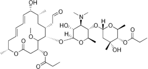 Мидекамицин (Midecamycin), IUPAC: (2S,3S,4R,6S)-6-{[(2R,3S,4R,5R,6S)-4-(dimethylamino)-5-hydroxy-6-{[(4R,6S,7R,9R,10R,11E,13E,16R)-10-hydroxy-5-methoxy-9,16-dimethyl-2-oxo-7-(2-oxoethyl)-4-(propanoyloxy)-1-oxacyclohexadeca-11,13-dien-6-yl]oxy}-2-methyloxan-3-yl]oxy}-4-hydroxy-2,4-dimethyloxan-3-yl propanoate, является природным 16-членным антибиотиком-макролидом, продуцируемым актиномицетом Streptomyces mycarofaciens.