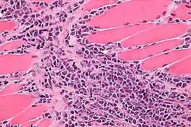 ![]() Микрофотография миелоидной саркомы в ткани мышцы | |