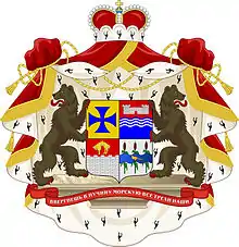 Описание герба: Щит четверочастный. В первой, золотой части, лазуревый лапчатый крест. Во второй части, волнообразно пересечённой червленью и лазурью, вверху серебряная мурованная крепость о двух башнях, с открытыми воротами, внизу три повышенных узких волнистых серебряных пояса. В третьей, червлёной, части серебряная мурованная зубчатая стена, над коей золотое руно. В четвёртой, серебряной, части, поверх трёх натуральных рогозов лазуревый волнистый пояс, обременённый золотым шествующим фазаном. Щитодержатели: два обернувшихся чёрных медведя с червлёными когтями и языками. Девиз: «Ввергнешь в пучину морскую все грехи наши» серебряными буквами на червлёной ленте. Герб украшен багряною, подбитой горностаем, мантиею с золотыми шнурами, кистями и бахромою и увенчан княжескою короною. |