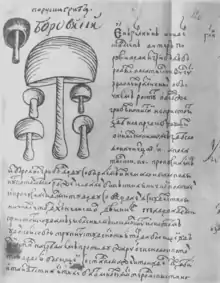 В России Самюэль Коллинз, английский придворный врач Алексея Михайловича написал небольшую книгу о «нынешнем состоянии России»[14], которая была издана в 1671 году в Лондоне. В ней имеется две таблицы рисунков «русских грибов», выполненных, однако, скорее лубочно. Во второй половине XVII — начале XVIII века в России появляется ряд травников и лечебников, часть из которых были переводными с западноевропейских языков, например, переведённая в 1672 году с немецкого «Книга Прохладный вертоград зовомая» или переведённая в 1705 году «Книга зовомая земледелательная<…> сложенная Агапием монахом критским<…> в Венетии 1674<…>». В переводных книгах содержатся сведения о грибах как о пище тяжёлой и причиняющей, особенно при частом употреблении, вред здоровью. В лечебнике 1672 года имеется рецепт полоскания горла молочным отваром гриба «уши Иудовы». В ещё одном лечебнике, точный год написания которого неизвестен, приводится подробное описание изготовления экстракта из белого гриба, применяемого при обморожениях II и III степени. Рисунок в этом лечебнике, вероятно, является первым изображением грибов, сделанным в России[15].