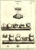 Слева направо: М. Мальпиги (1628—1694); Мальпиги, рисунок опухоли стебля боярышника (1675); рисунки из «Микрографии» Р. Гука — голубая плесень и ржавчина розы; сфероболусы, рис. П. А. Микели; П. А. Микели (1679—1737) | ||||||||||