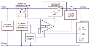 Схема защиты от перегрева расположена «выше по течению» и работает независимо от защиты по ОБР: при температуре кристалла порядка +125 °С напряжение на последовательно включенных эмиттерных переходах Т2, Т3 падает настолько, что цепь защиты перехватывает управление выходным транзистором, и напряжение на выходе падает.
