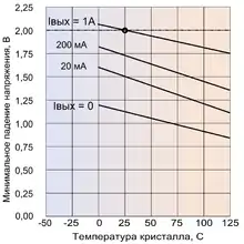 Пренебрегая первой составляющей (Uкэ.нас. Т11), можно считать, что на предельном рабочем токе Uпд.мин. равно трём Uбэ, а на токах, во много раз меньших, чем предельный — двум Uбэ. Каждая из этих Uбэ нелинейно возрастает с ростом тока и линейно уменьшается с ростом температуры. Наилучшие с точки зрения минимизации Uпд.мин. условия наблюдаются при малых выходных токах и при максимально допустимой температуре (+125 °C) — в этих условиях Uпд.мин. составляет около 1,0 В. В наихудших условиях (максимальный ток при минимальной температуре) Uпд.мин. составляет от 2,0 до 2,5 В. Именно эти, наихудшие, значение Uпд.мин. и приводятся в кратких справочных данных.