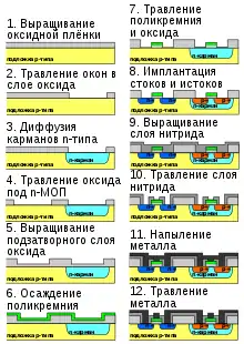 Изготовление микроустройства представляет собой, как правило, чередование операций нанесения тонких слоёв и травления. Таким образом, устройство представляет собой «стопку» двухмерных структур из разных материалов. Также используются различные операции модификации поверхности: отжиг, легирование, окисление, восстановление и другие. Основополагающий принцип — одновременное изготовление сразу большого количества устройств, как правило, размещённых на одной подложке и разделяемых только на финальной стадии производства.