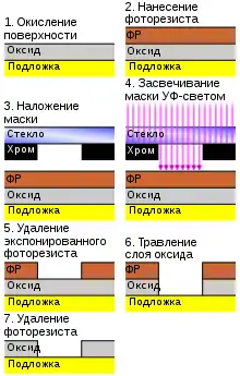 Как правило, нужно сформировать на подложке различные структуры или сквозные отверстия в слое. Эти структуры имеют микронные или нанометровые размеры и способы их формирования определяют возможности технологии. Для их формирования при помощи фотолитографии создают маску, защищающую от действия травителя те участки, которые должны быть оставлены[3].