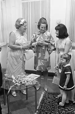 ![]() Королева Нидерландов Юлиана и принцесса Маргрит принимают Сусанну Милдонян с дочерью Алисой (1969) | |