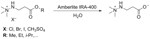 Согласно патенту, метод синтеза мельдония в цвиттер-ионной форме заключается в пропускании соответствующего сложного эфира через колонку с сильноосновной анионообменной смолой (например, Amberlite IRA-400). Природа аниона Х- не влияет на эффективность синтеза, а в качестве исходных соединений используется метиловый, этиловый, изопропиловый и другие низшие сложные эфиры. При прохождении вещества через колонку происходит одновременный гидролиз сложноэфирной группы и обмен аниона на гидроксид-ион. Растворителем для синтеза может служить вода или полярный органический растворитель, например спирт[7].