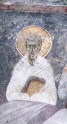 ![]() Мина патриарх. Фреска XIV века. Северная стена нефа монастыря Грачаница. Сербия | ||
