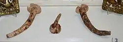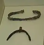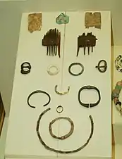 Грунтовое погребение (поздняя бронза — раннее железо) из Мингечевира и роговые псалии из погребения № 77[42][43] (XI—IX вв. до н. э.). Музей истории Азербайджана (Баку) |