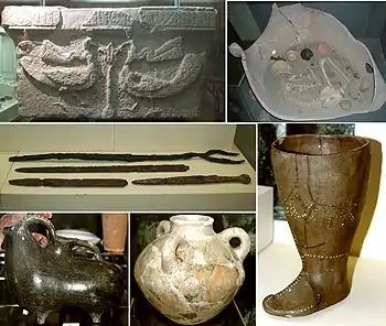 ![]() Находки из Мингечевира в Музее истории Азербайджана: каменная капитель колонны храма с албанской надписью (V—VI вв.), кувшинное захоронение с инвентарём (II век до н. э. — II век н. э.), железные мечи, вилы и кинжал (III век до н. э. — VIII век), керамика в форме барана (IV век до н. э. — III век н. э.), глазурованный сосуд, привезённый из Ассирии (XIII—VIII вв. до н. э.), глиняный сосуд в виде сапога (XIII—VIII вв. до н. э.) | ||