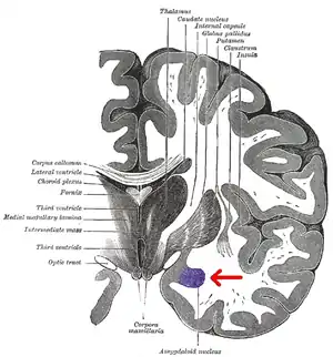 Миндалевидное тело (лат. corpus amygdaloideum), амигдала — область мозга миндалевидной формы, находящаяся в белом веществе височной доли полушария под скорлупой, примерно на 1,5–2,0 см сзади от височного полюса. В мозге два миндалевидных тела — по одному в каждом полушарии[2]. Миндалевидное тело играет ключевую роль в формировании эмоций, в частности страха. У пациента, миндалевидное тело которого оказалось полностью разрушено вследствие болезни Урбаха-Вите, наблюдалось отсутствие страха[3][4][5]. Миндалевидное тело также играет важную роль в функционировании памяти, принятии решений и эмоциональных реакциях[6]. Миндалевидное тело является частью лимбической системы, относится к подкорковым обонятельным центрам.