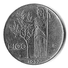 Через полторы тысячи лет после падения Римской империя Минерва вновь появилась на ста лирах Италии 1954—1992 годов[41].