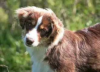 Мини аусси окраса красный триколор с карими глазами