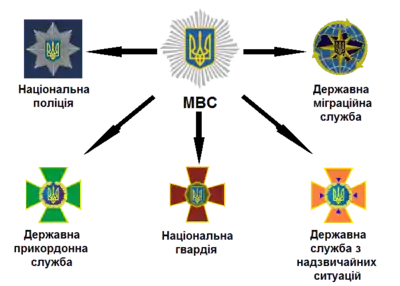 МВД Украины является главным (ведущим) органом в системе центральных органов исполнительной власти по вопросам формирования и реализации государственной политики в сфере защиты прав и свобод граждан, интересов общества и государства от противоправных посягательств, ведения борьбы с преступностью, охраны общественного порядка, обеспечения общественной безопасности, безопасности дорожного движения, охраны и обороны особо важных государственных объектов.