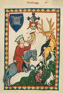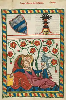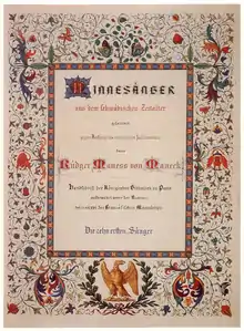 Миннеза́нг[1] (ср.-в.-нем. minnesang [2][3]; ср.-в.-нем. minne любовь, отсюда миннезанг букв. — «любовная песня»[4][5][6][7]) — обобщённое название искусства миннези́нгеров (нем. Minnesänger; ср.-в.-нем. minnesinger [5][8], от minne + ср.-в.-нем. singer певец; букв. — «певец любви»[5][9]), немецких и австрийских средневековых поэтов-музыкантов, преимущественно из рыцарского сословия[10]. По своему характеру миннезанг близок к поэзии трубадуров и труверов. В отличие от провансальской и северофранцузской лирики, чувственность и гедонизм в миннезанге несколько более сдержанны[9][11][12] и играют значительно меньшую роль[11]. Немецкая рыцарская поэзия умозрительна и морализованна, многие произведения имеют религиозный оттенок[11][12]. В своих произведениях миннезингеры[1][8][13][14][15] воспевали рыцарскую любовь к Прекрасной Даме, служение Богу и сюзерену.