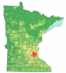 слушать)) — штат[6] на Среднем Западе США. В штате проживает 5 709 752 человек[3] (2020, 22-е место в США), главным образом немецкого (37,3 %), норвежского (17,0 %), ирландского (12,2 %) и шведского (10,0 %) происхождения. Столицей штата является город Сент-Пол. Крупнейший город штата — Миннеаполис. Другие крупные города: Блумингтон, Дулут, Рочестер, Бруклин-Парк.