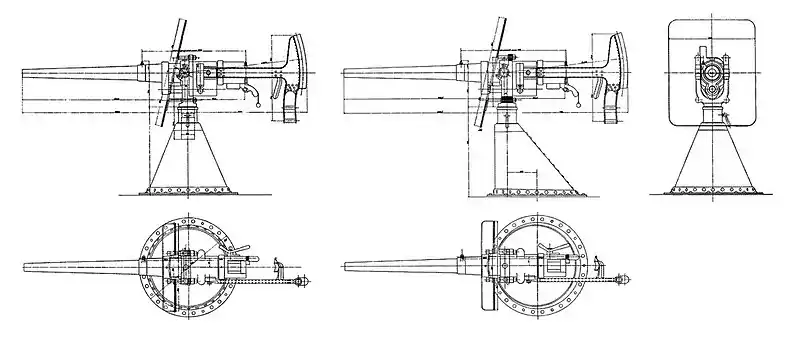 47-мм пушки с длиной ствола в 43,5 калибра устанавливались на вертлюжных станках с прямой или наклонной тумбами. Наведение в горизонтальной и вертикальной плоскостях осуществлялось посредством ртутного компрессора системы Меллера. Штатный боекомплект составлял 1350 стальных и чугунных гранат с ручной подачей из патронных погребов.