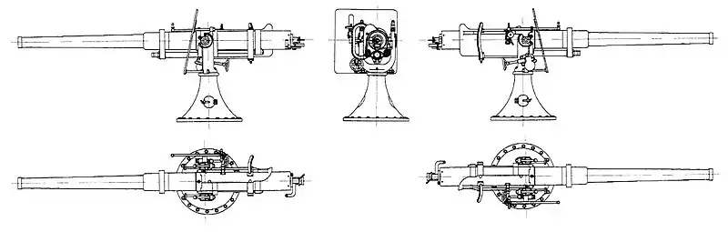 Пушка с длиной ствола в 50 калибров устанавливалась на облегчённом станке Меллера. Штатный боекомплект состоял из 160 бронебойных снарядов, подача боеприпасов из трюма корабля осуществлялась механическим способом. Система вертикальной наводки механическая. Система горизонтальной наводки отсутствовала: для разворота орудия наводчику необходимо было упереться в специально предусмотренный плечевой упор.