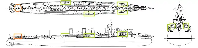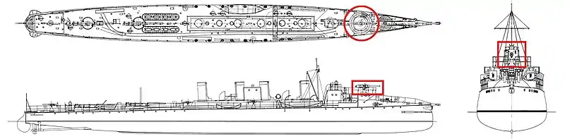 С завода миноносцы оснащались одной носовой 75-мм и пятью 47-мм пушками (по 2 на каждый борт и 1 в кормовой части).