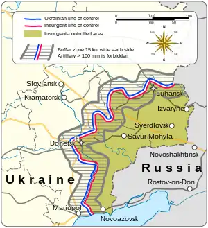 ― Граница контроля Украины― Граница контроля формирований ДНР и ЛНР― Предельные границы 30-км буферной зоны для артиллерии калибром > 100 мм Территория, контролируемая формированиями ДНР и ЛНР по состоянию на 19 сентября 2014 г.