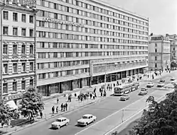 В 1963—1964 годах была построена гостиница. Она представляла собой 9-10-этажную пластину с горизонтальными полосами ленточными окнами, которая расположена с некоторым отступом от красной линии. Гостиница имела номерной фонд в 400 номеров.
