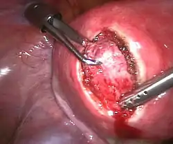 Лапароскопическая миомэктомия: матка надрезана, узел захвачен и готов к вылущиванию