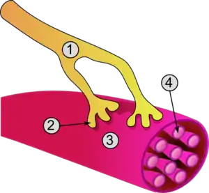 Каждое скелетное мышечное волокно отдельно иннервируется возбуждающим моторным аксоном.[11]