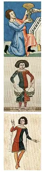 Одежда мипарти появилась в конце XII века в Западной Европе. Она была тесно связана с геральдикой, так как было распространено, что вассалы (в основном молодёжь и пажи) и слуги, а также супруга феодала на торжествах носили одежду его герба[5][1][2][6]. В стиле мипарти вплоть до XVI века существовала и военная форма, дольше всего она продержалась в Швейцарии.[4]