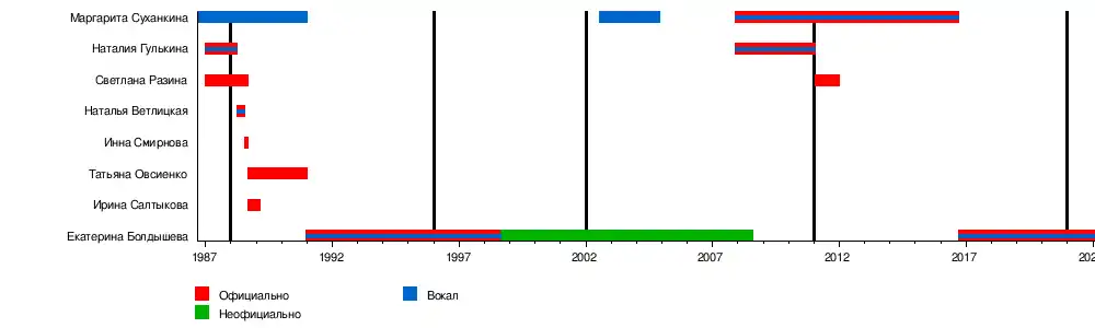 Маргарита Суханкина (1986—1990 (вокал), 2005—2016) Наталия Гулькина (1987—1988) (2005—2011) Светлана Разина (1987—1988) (2011) Инна Смирнова (1988) Наталья Ветлицкая (1988) Ирина Салтыкова (1988—1989) Татьяна Овсиенко (1988—1990) |