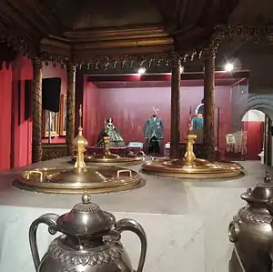 - Кадь. «После окончания чина мироварения, готовое миро помещалось для охлаждения в серебряную кадь, подаренную в 1767 году императрицей Екатериной II. Крышку кади венчают литые позолоченные фигуры: пророк Самуил возливает елей на голову царя Давида»[8].