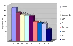 Одной из мер энергоэффективности страны является энергоёмкость, которая показывает какое количество энергии нужно стране, чтобы произвести один доллар ВВП.