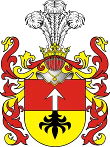 Щит, пересечённый красным и золотым, на котором серебряная стрела с чёрным орлиным хвостом на конце; в нашлемнике — три страусовых пера. Герб этот из Моравии[3].